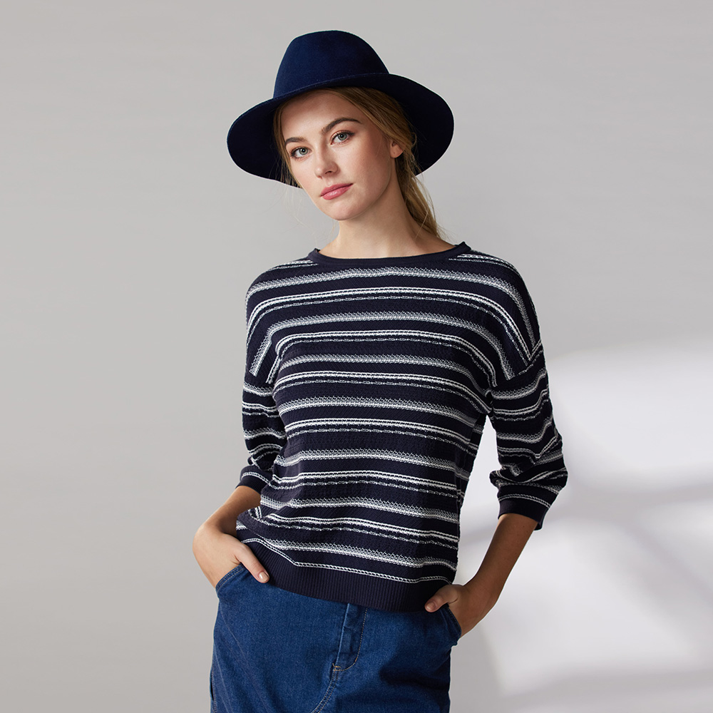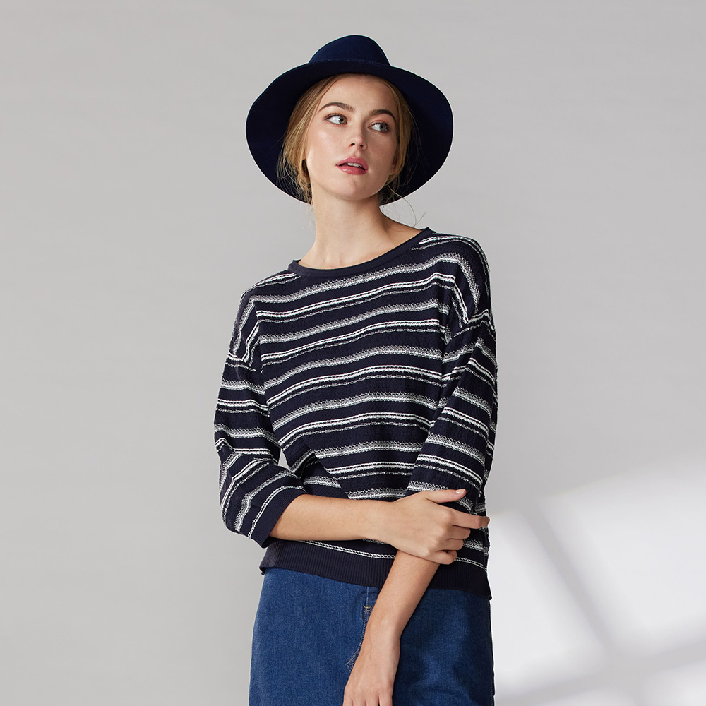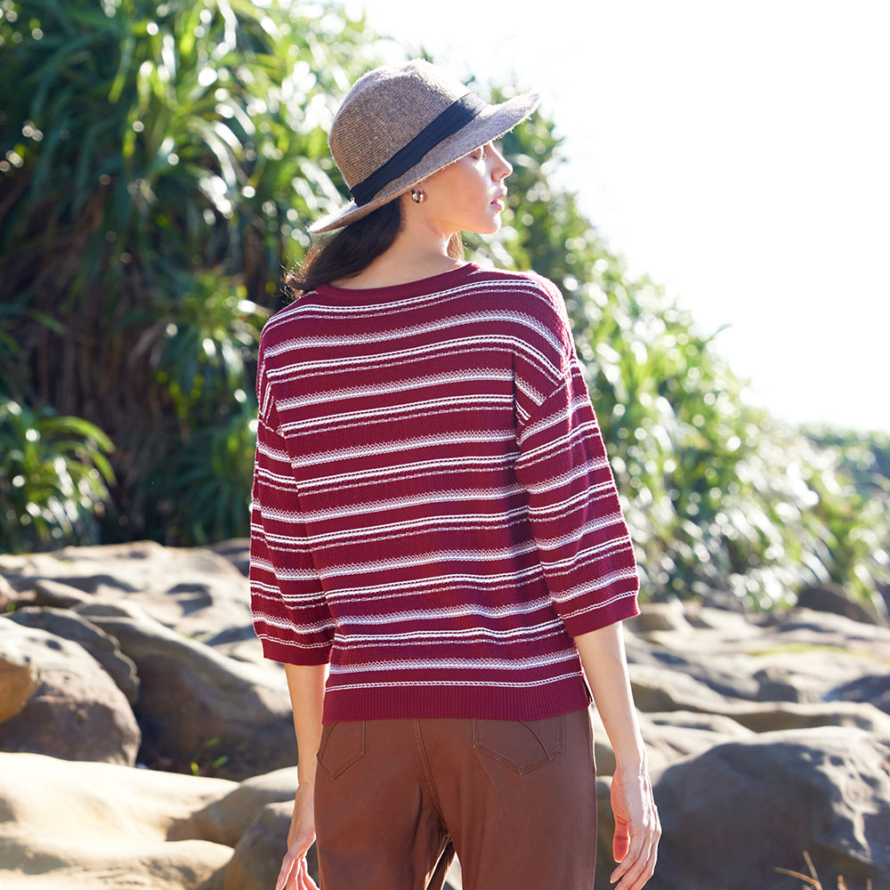 有機棉圓領配條落肩七分袖針織衫(2色)