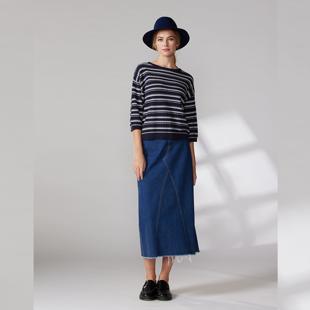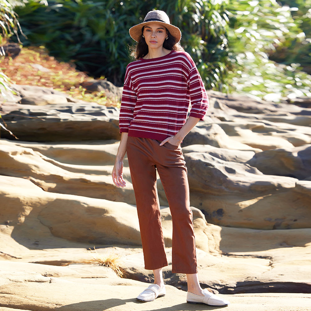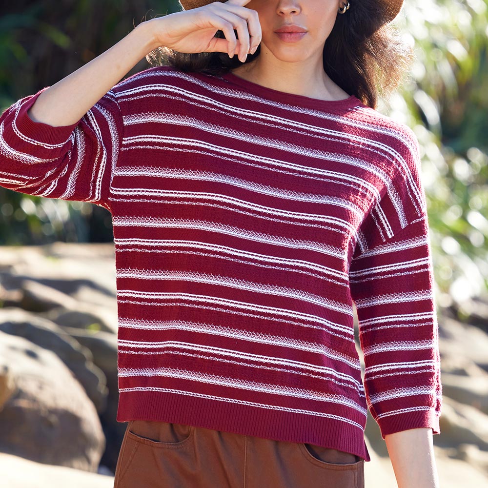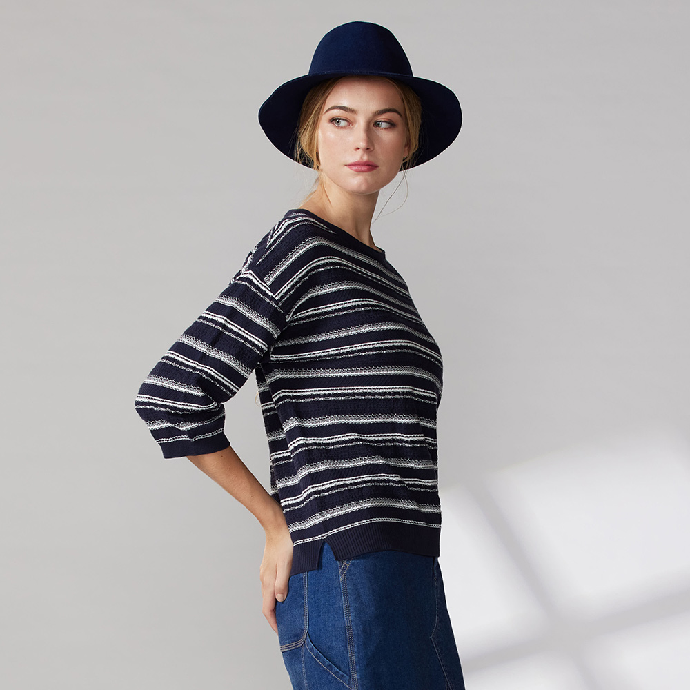 有機棉圓領配條落肩七分袖針織衫(2色)