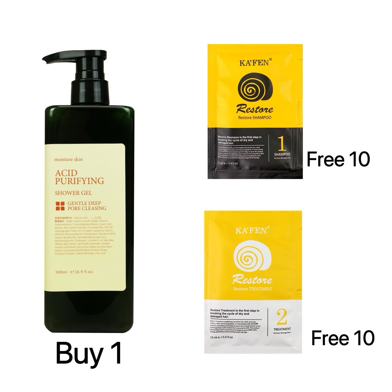 Buy 1 set- Acid Purifying Shower Gel 500ml+Restore Shampoo 12ml*10+Restore Treatment 15ml*10