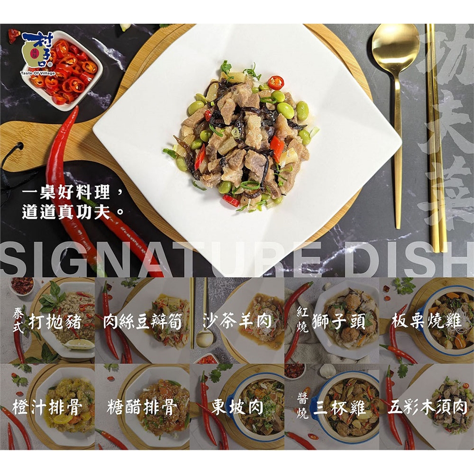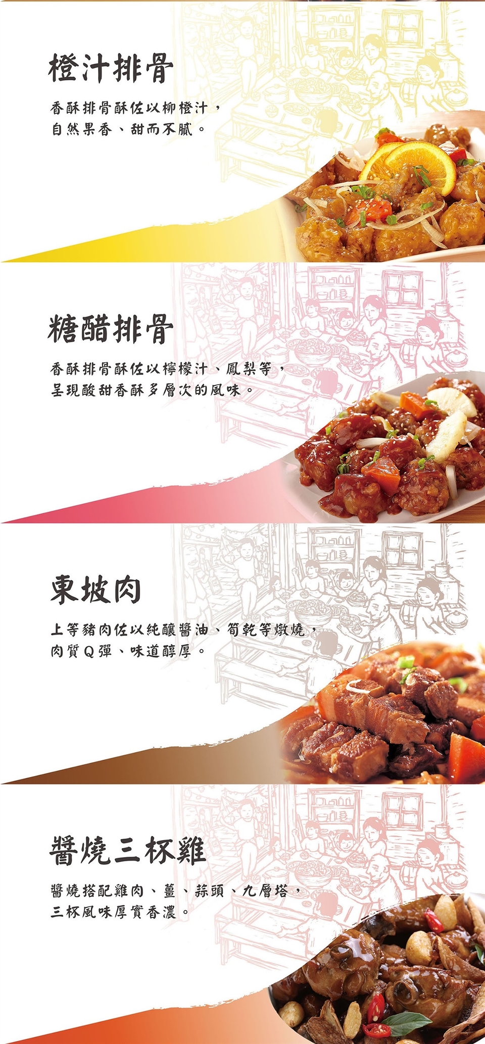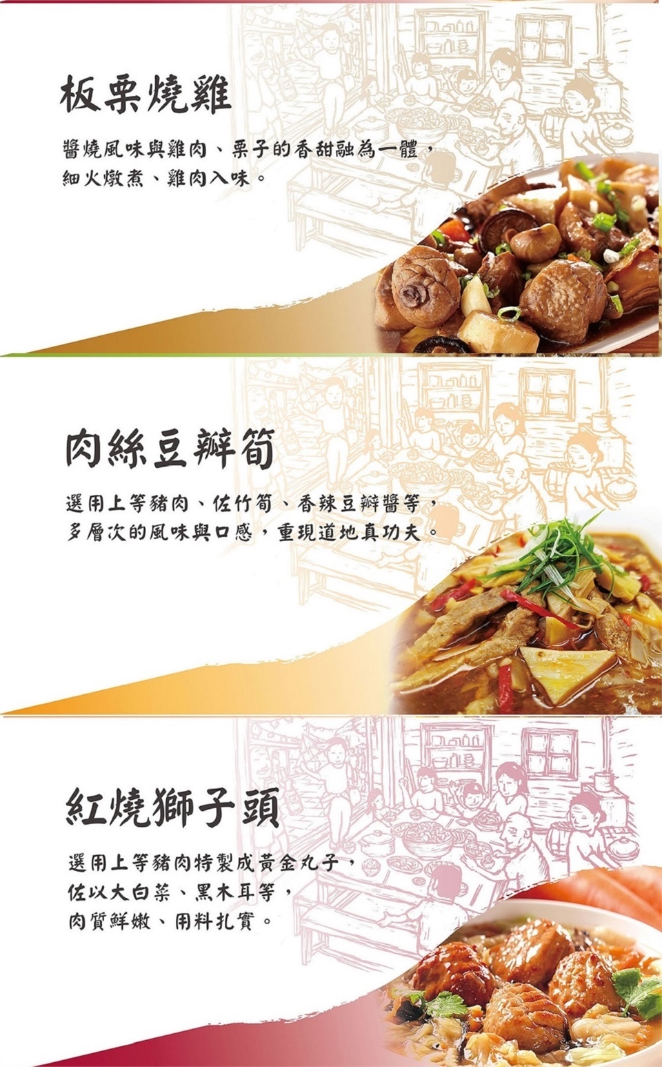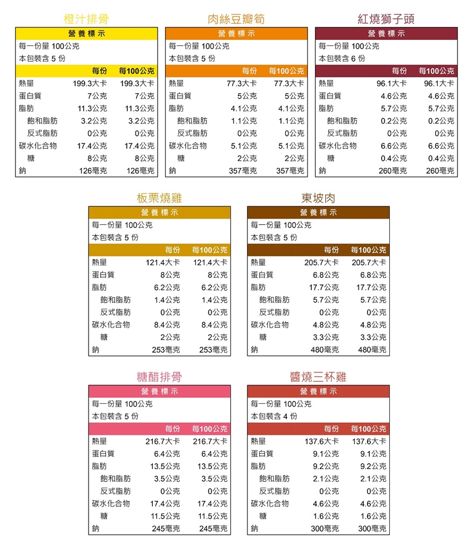 東坡肉內容量:500公克(固形量300公克)、醬燒三杯雞內容量:400公克(固形量220公克)、板栗燒雞內容量:500公克(固形量350公克)、橙汁排骨內容量:500公克(固形量300公克)、糖醋排骨內容量:500公克(固形量300公克)、紅燒獅子頭內容量:600公克(固形量370公克)