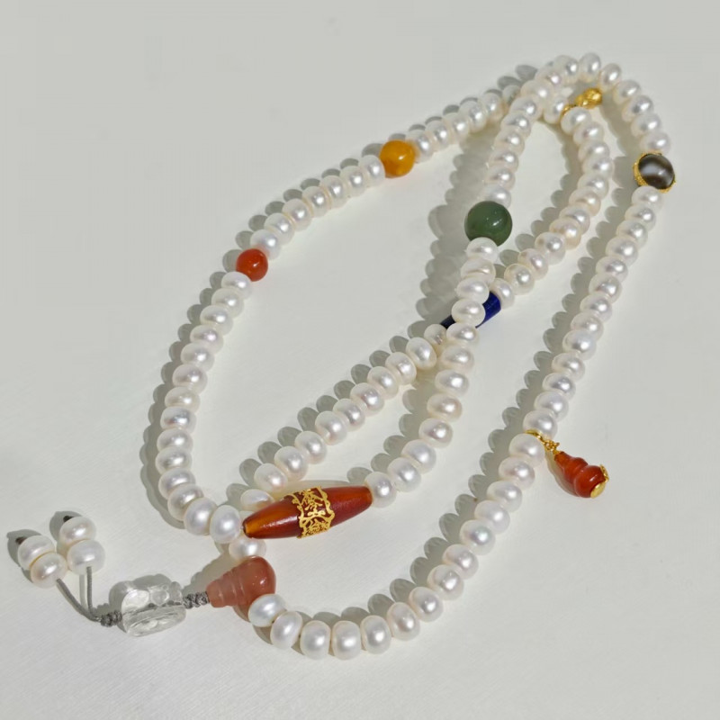 B18a 8m淡水珍珠藏式多宝三通貔貅佛珠项链 (后台)
