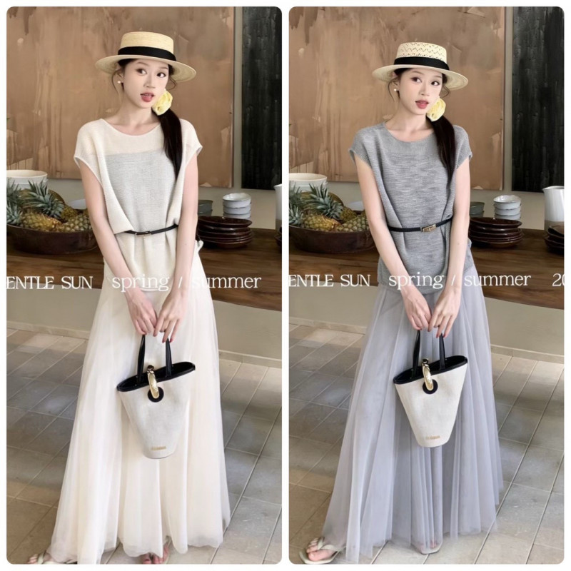 A429仙女搭配-質感針織上衣+仙女紗裙(附腰帶)