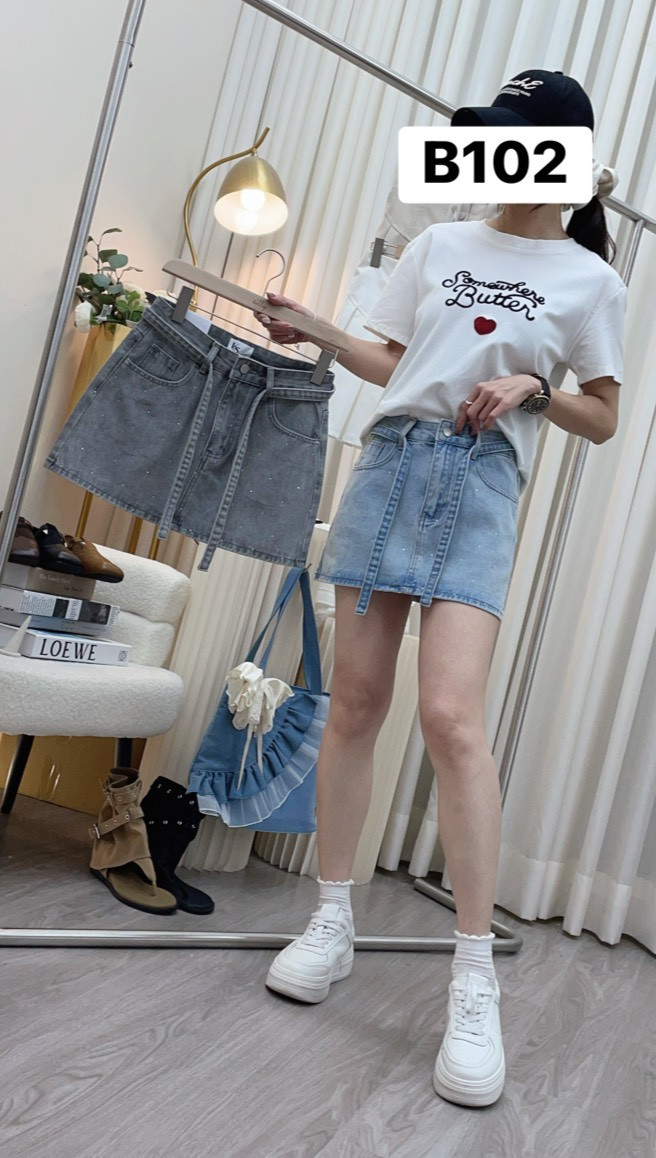 B102款 (3552)碎鑽綁帶中腰牛仔裙$399