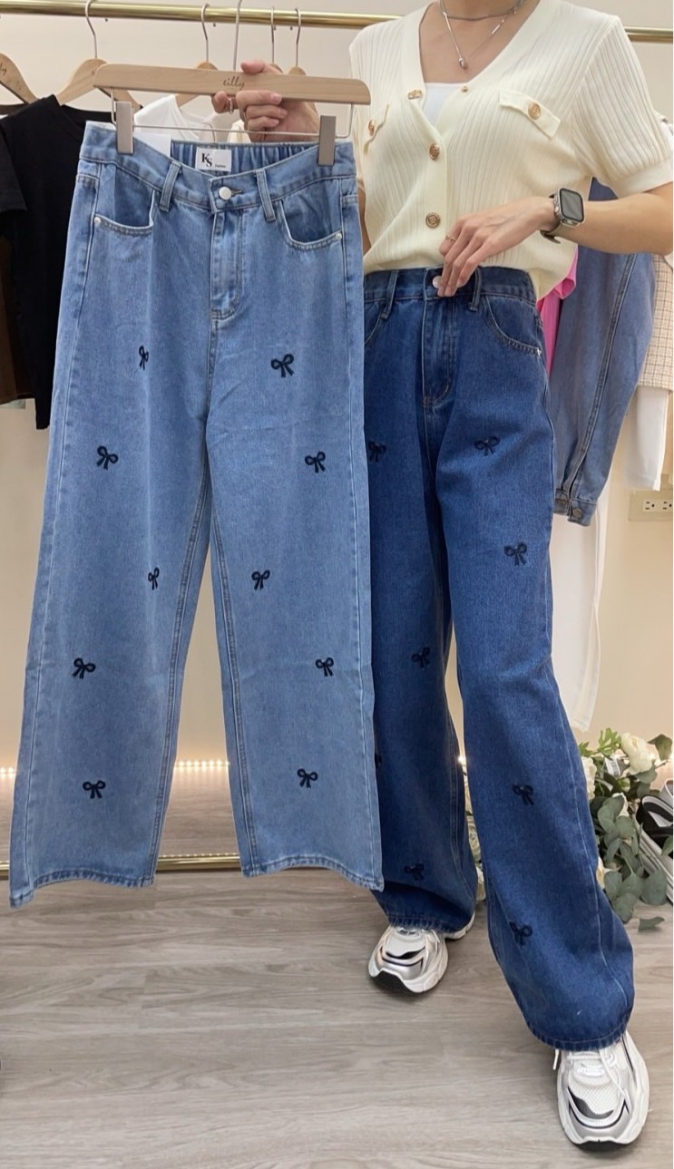 B107款 (2902)刺繡蝴蝶結牛仔寬褲$399