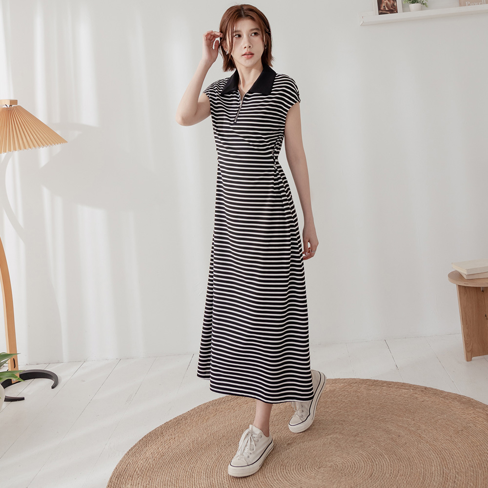 熱賣中🔥 即將售完niceioi 輕鬆不隨性!半拉鍊蓋袖收腰POLO領條紋長洋裝