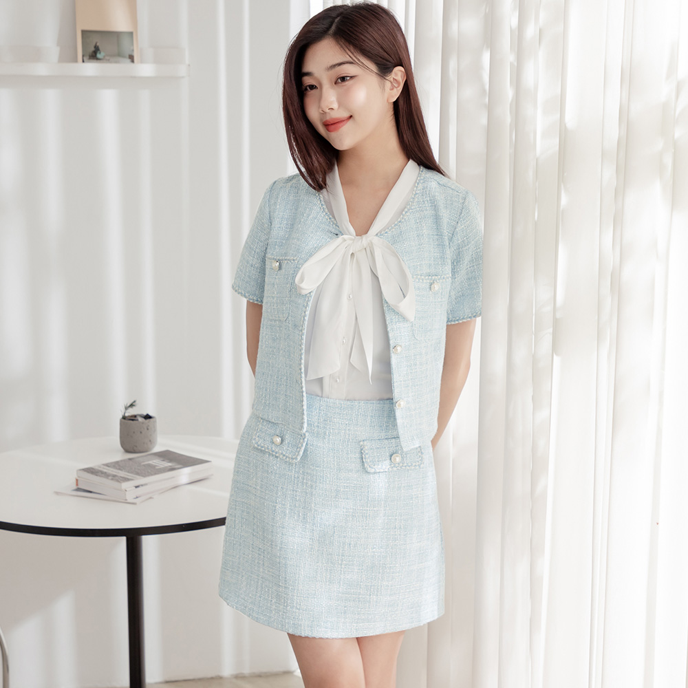 熱賣中🔥 即將售完niceioi 水藍小香珍珠方格織紋滾邊短袖外套