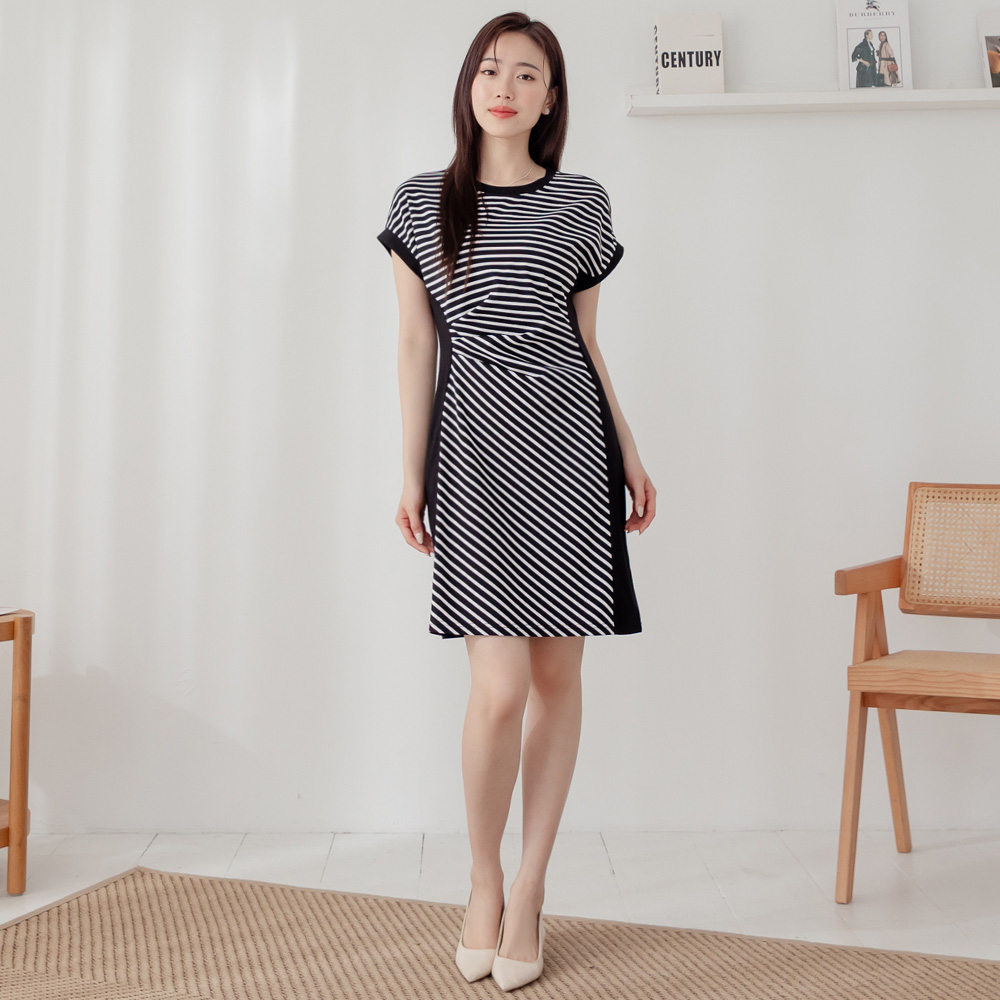 熱賣中🔥 即將售完niceioi 都會美撞色修身羅馬布條紋蓋袖短洋裝
