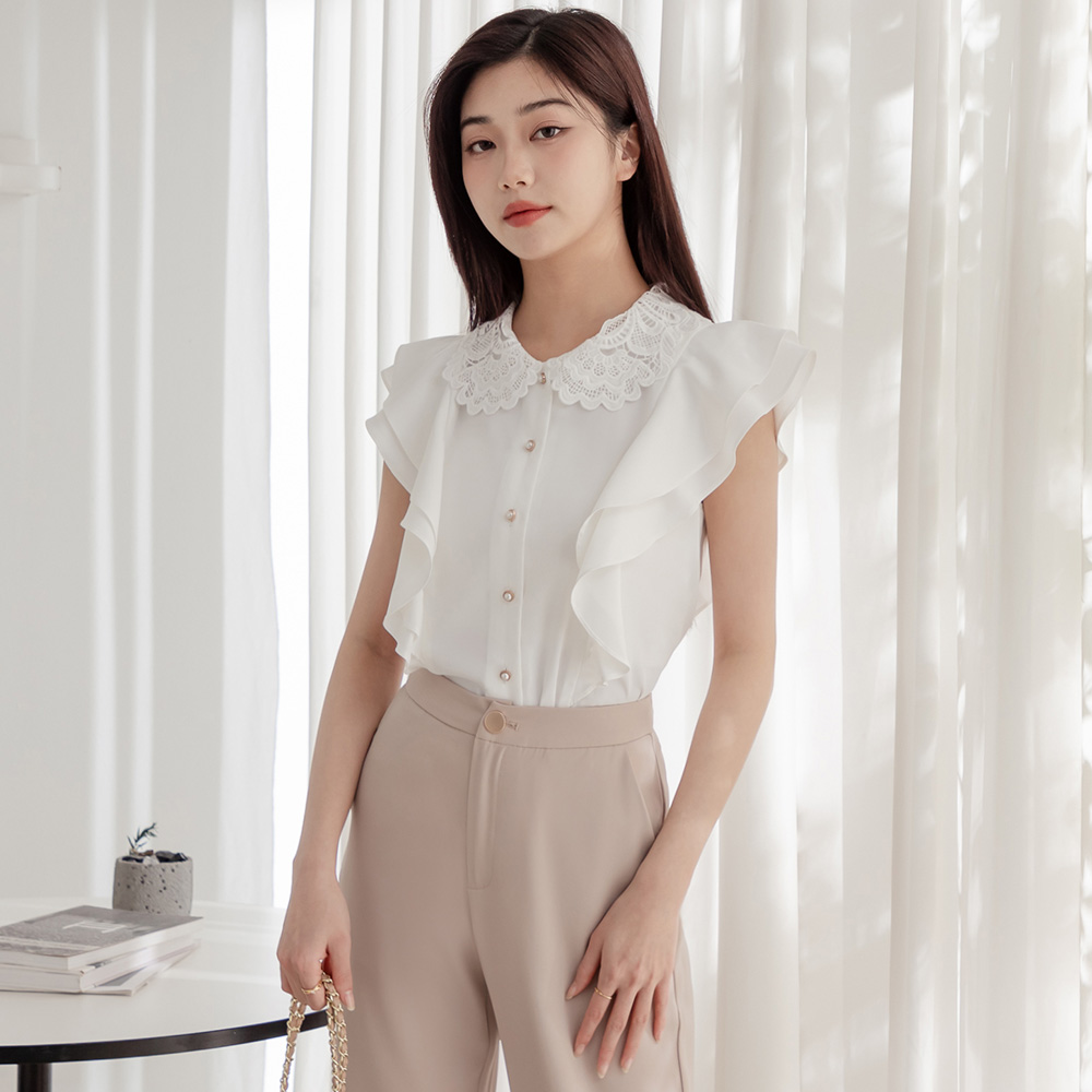 熱賣中🔥 即將售完niceioi 漣漪雙層波浪蓋袖雕花領珍珠上衣