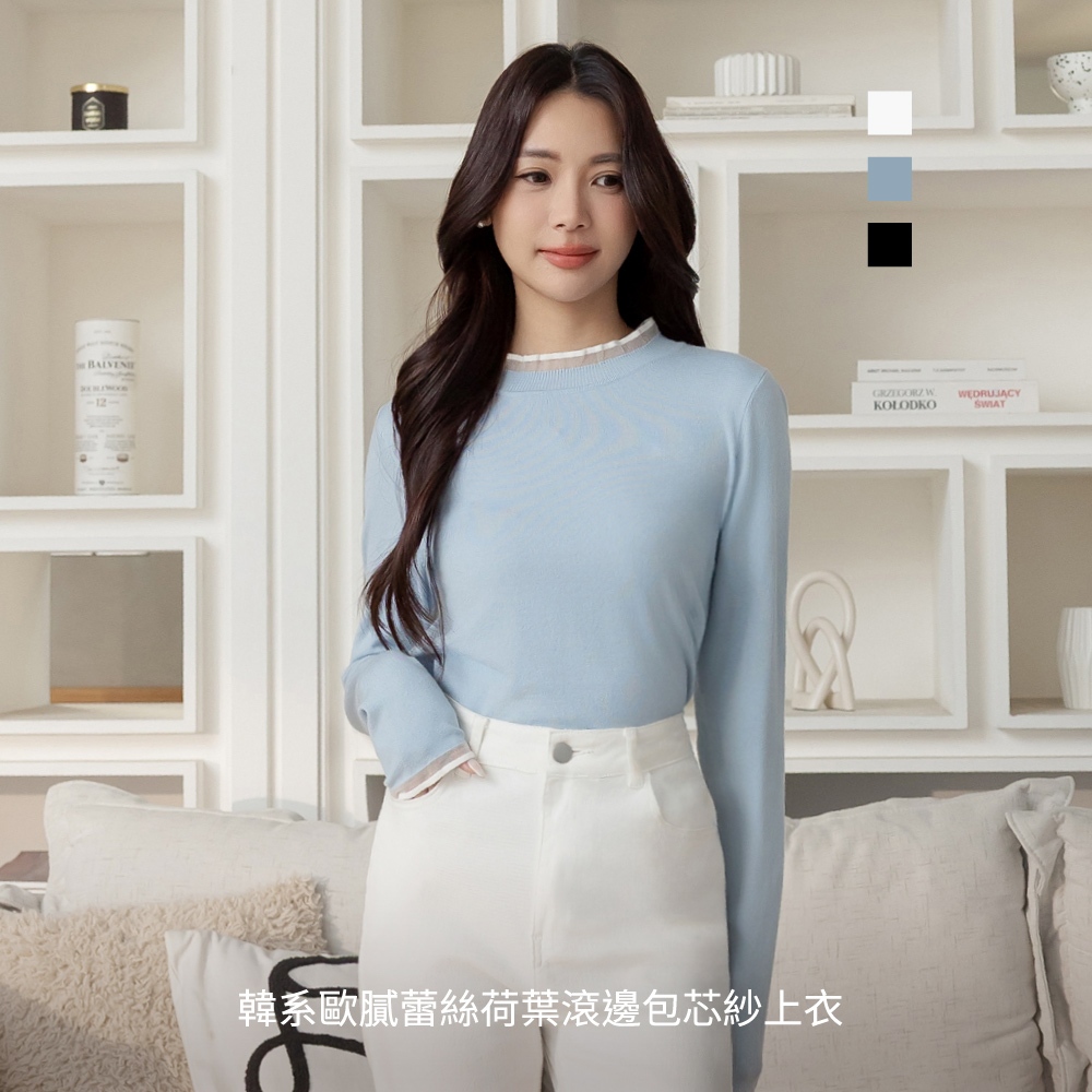 熱賣中🔥 即將售完【超值推薦】niceioi 韓系溫柔歐膩蕾絲荷葉滾邊包芯紗上衣 S-XL