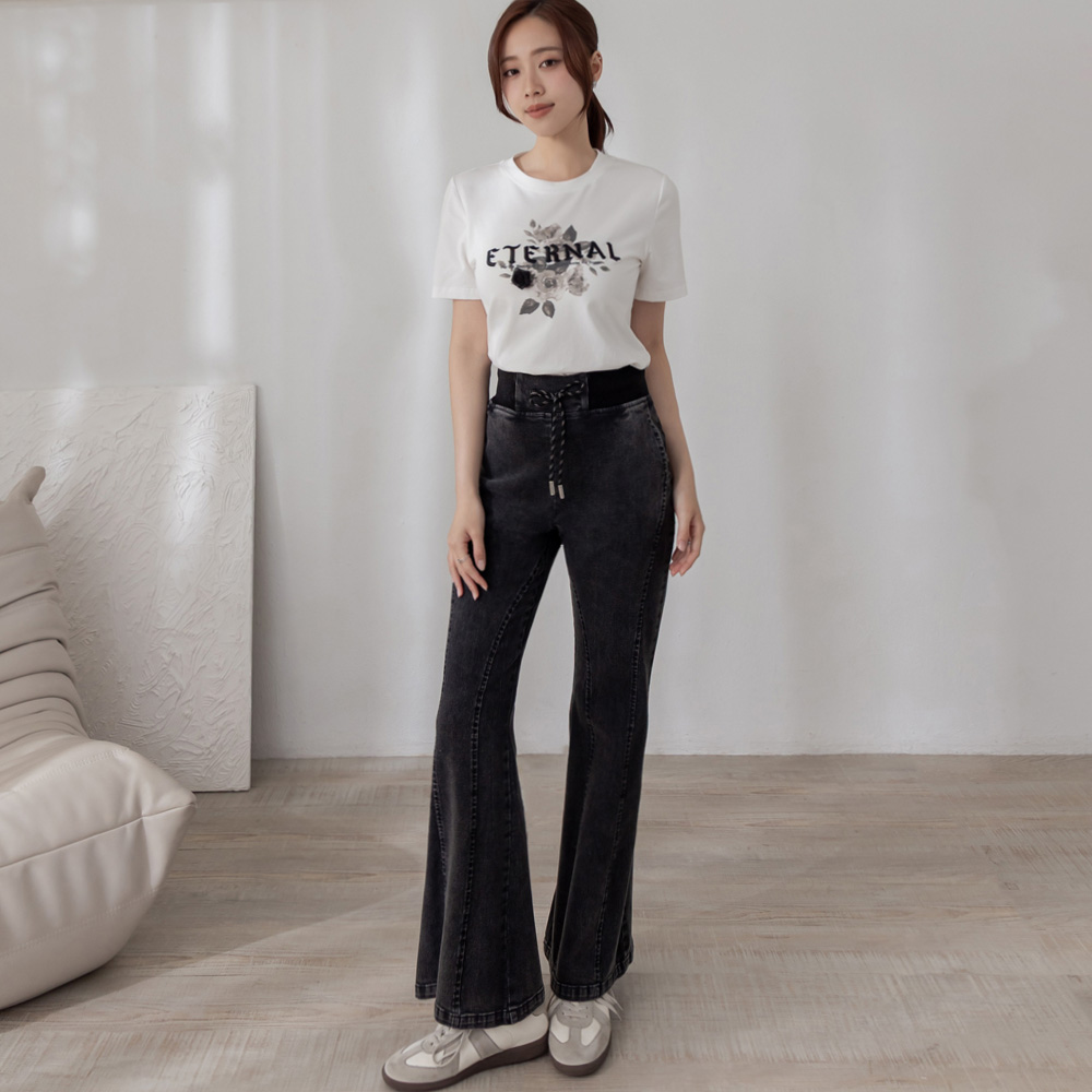 熱賣中🔥 即將售完niceioi 洗鍊黑調顯瘦抽繩鬆緊喇叭牛仔褲