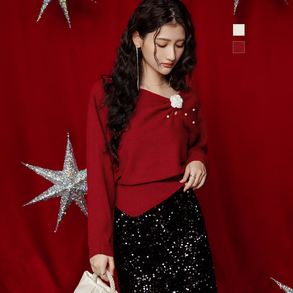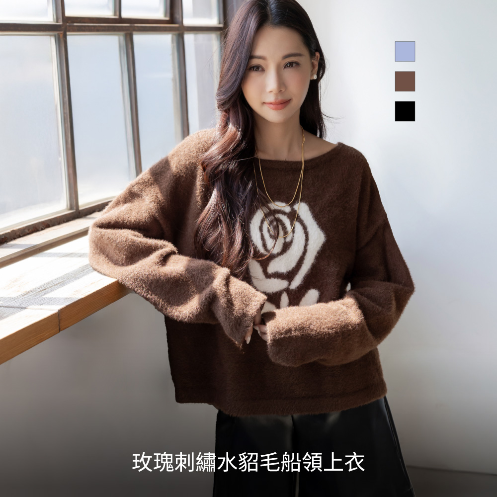 熱賣中🔥 即將售完【超值推薦】niceioi 韓系浪漫玫瑰刺繡水貂毛船領上衣S-L