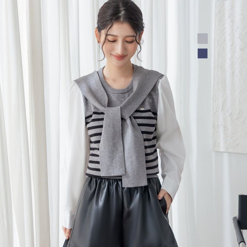 熱賣中🔥 即將售完niceioi 知性海軍風條紋綁帶襯衫拼接針織上衣