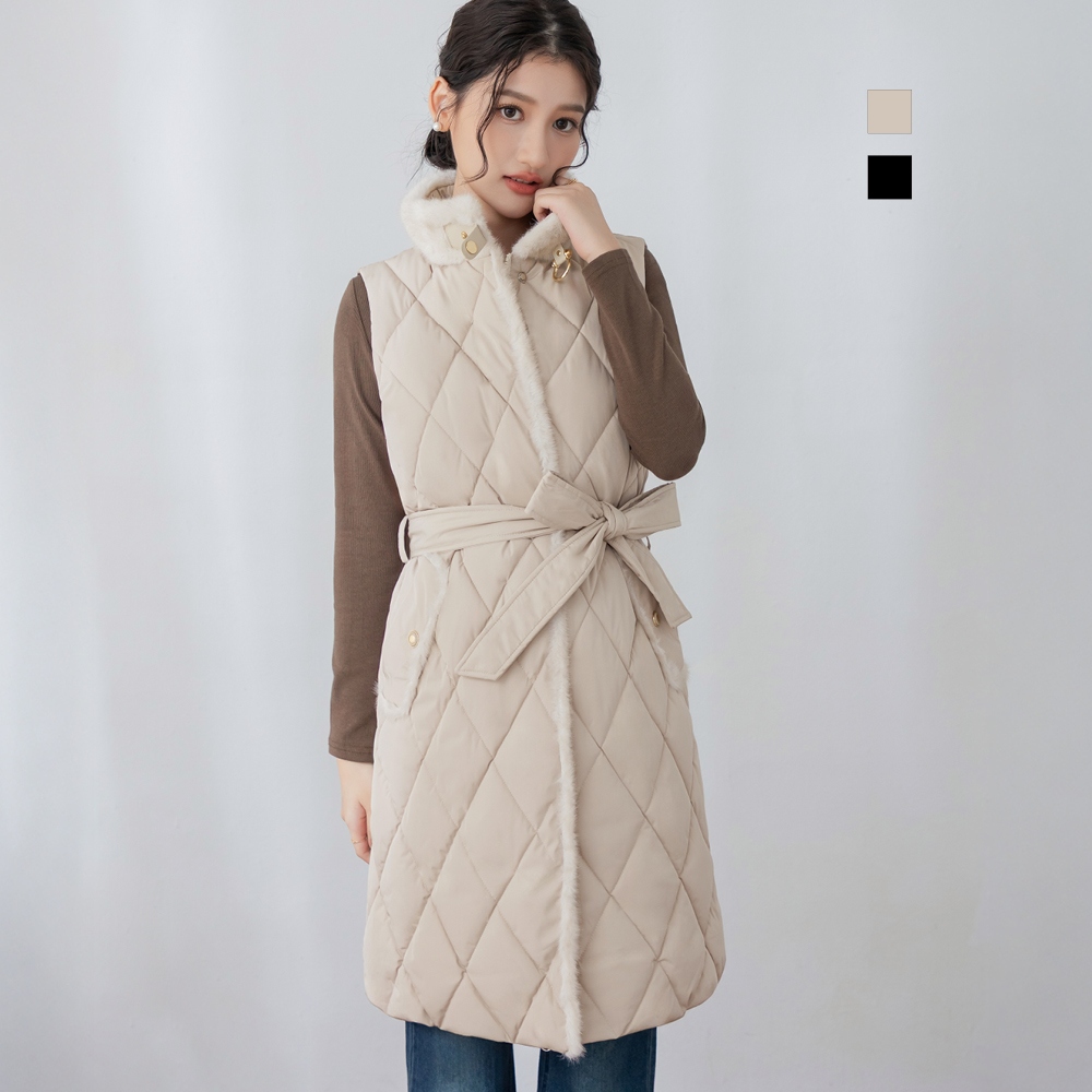 熱賣中🔥 即將售完niceioi 秋冬保暖菱格鋪棉拼接毛領背心外套(附腰帶)