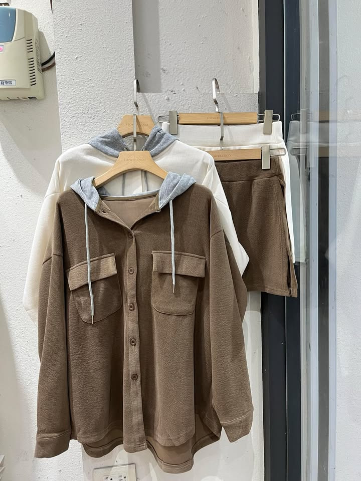 熱賣中🔥 即將售完B27連帽坑紋開釦衫+側岔褲裙SET