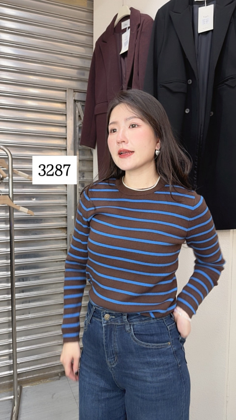 熱賣中🔥 即將售完女KN1113-3287咖底藍條紋針織長袖圓領上衣