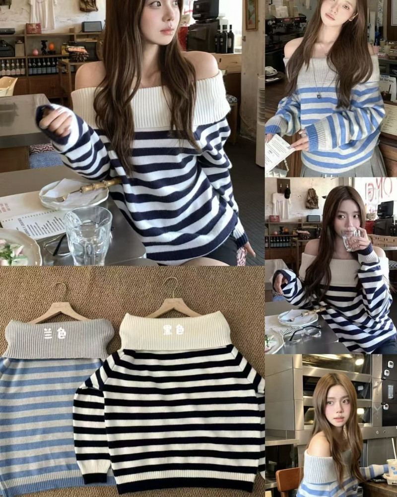熱賣中🔥 即將售完A435可拉一字領條紋毛衣