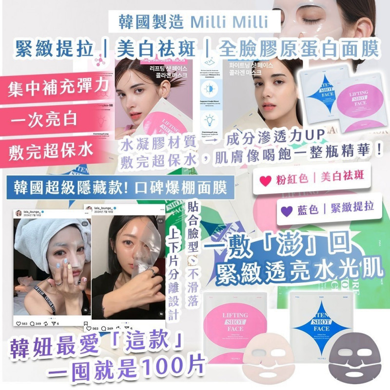 熱賣中🔥 即將售完06預購- #MILLIMILLI超能膠原蛋白水凝面膜33g-美白祛斑(藍色)*5片 #MILLIMILLI超能膠原蛋白水凝面膜33g-緊緻拉提(粉紅色)*5片