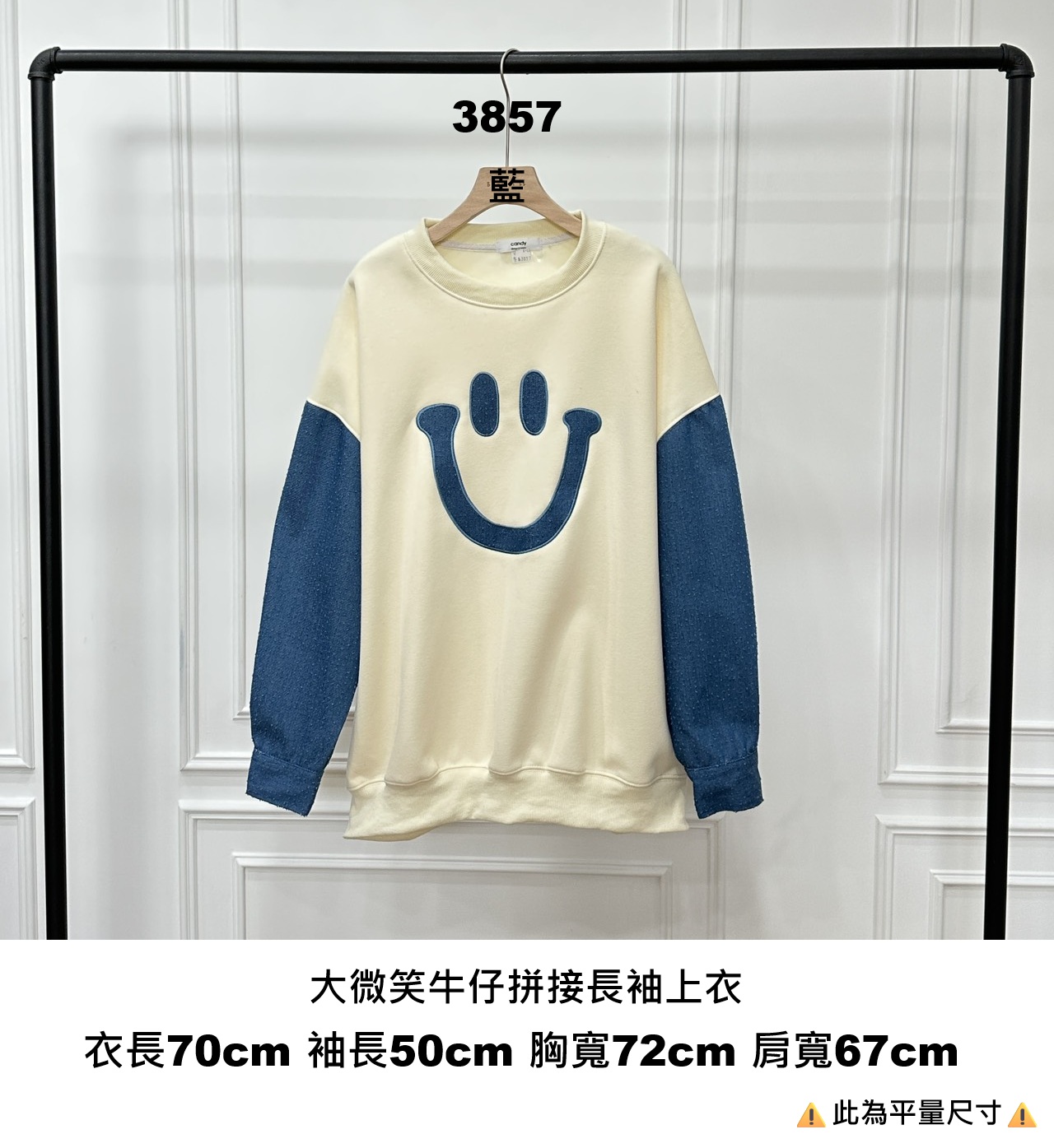 熱賣中🔥 即將售完(預購006)女V0103-3857杏大微笑牛仔拼接長袖上衣1400592(杏)