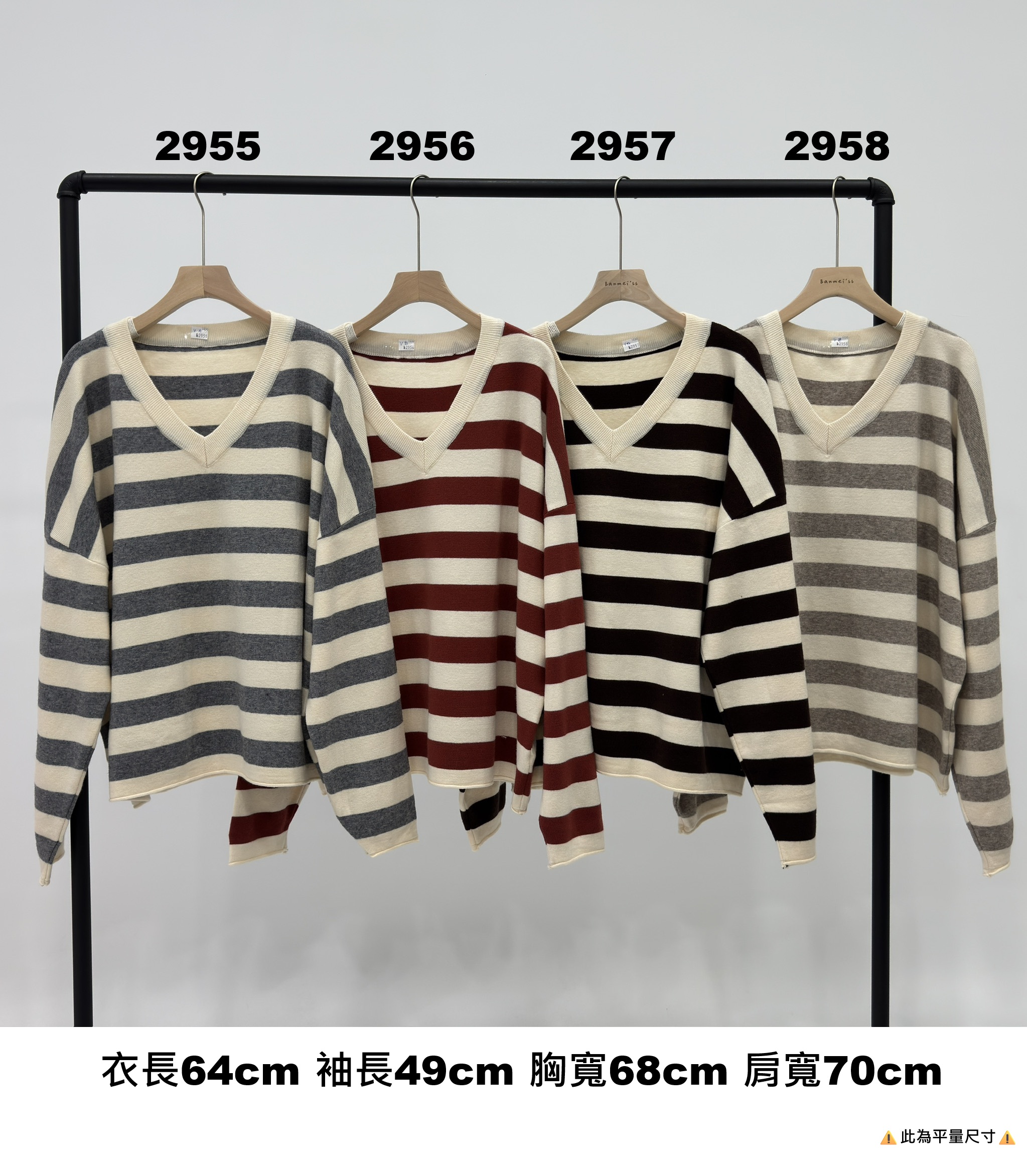 熱賣中🔥 即將售完女V1030-V領橫條紋捲邊針織長袖上衣