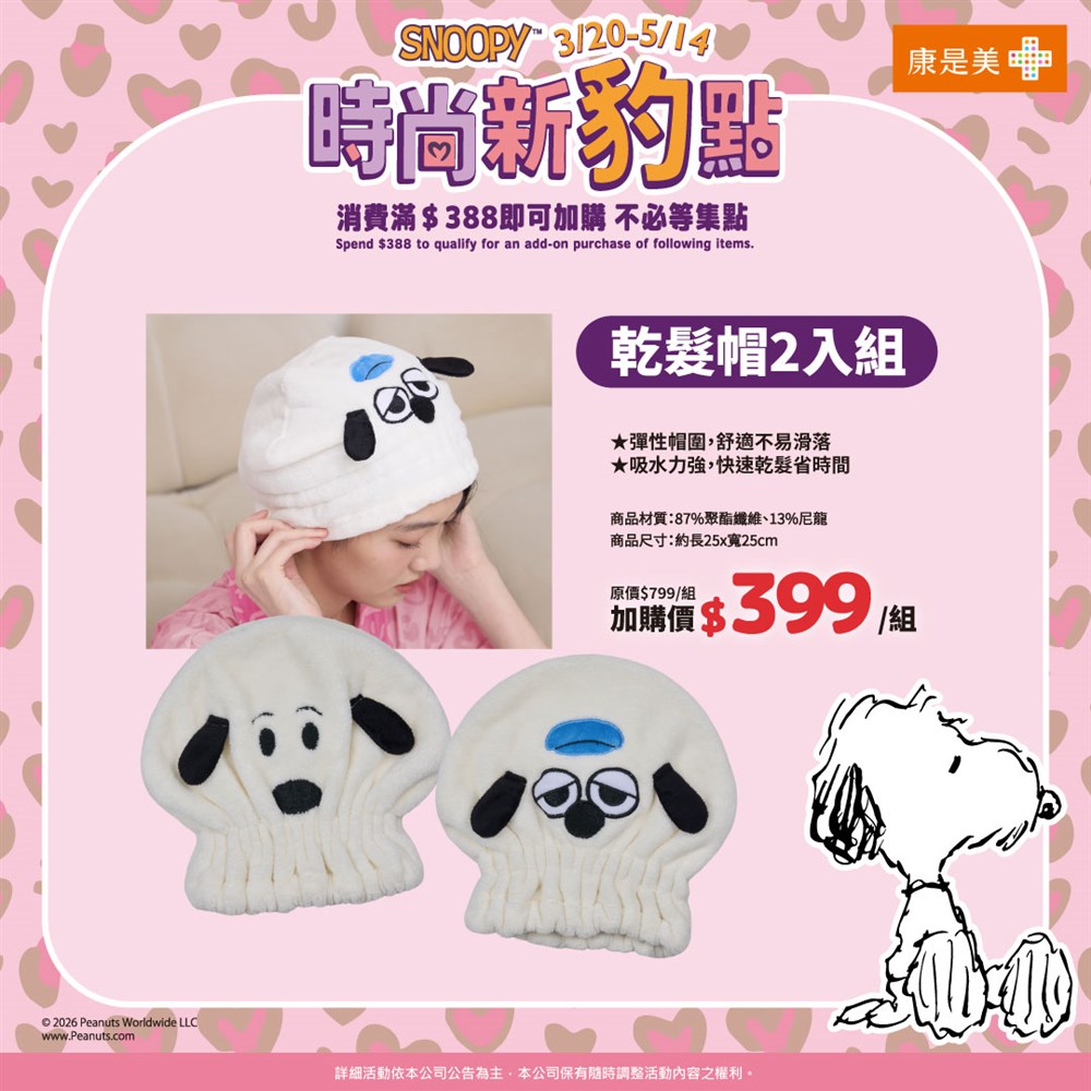 熱賣中🔥 即將售完SNOOPY乾髮帽2入組(2026/3/20開賣)