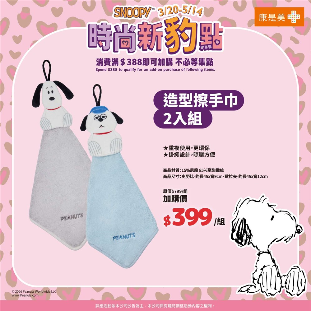 熱賣中🔥 即將售完SNOOPY造型擦手巾2入組(2026/3/20開賣)