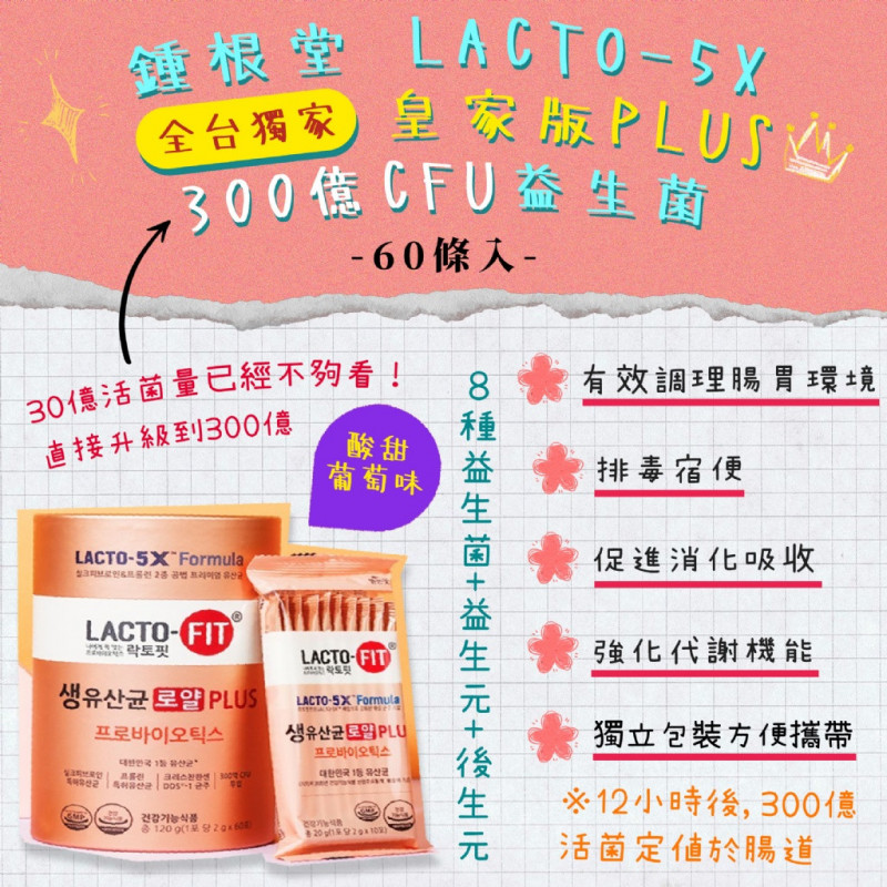 熱賣中🔥 即將售完H159鍾根堂LACTO-5X全台獨家皇家版PLUS300億CFU益生菌(2gx60入)