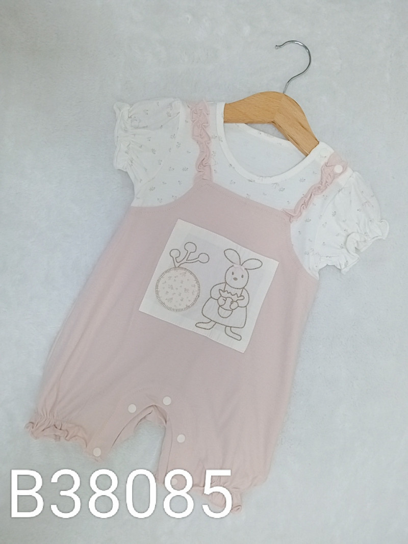 熱賣中🔥 即將售完B38085_J6_白底粉碎花拼接粉色兔子貼布吊帶假兩件爬服