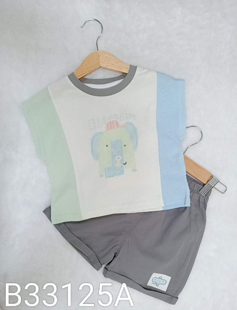 熱賣中🔥 即將售完B33125A_L7_杏底灰領大象溜滑梯拼接藍綠袖上衣+灰底大象貼布短褲套裝