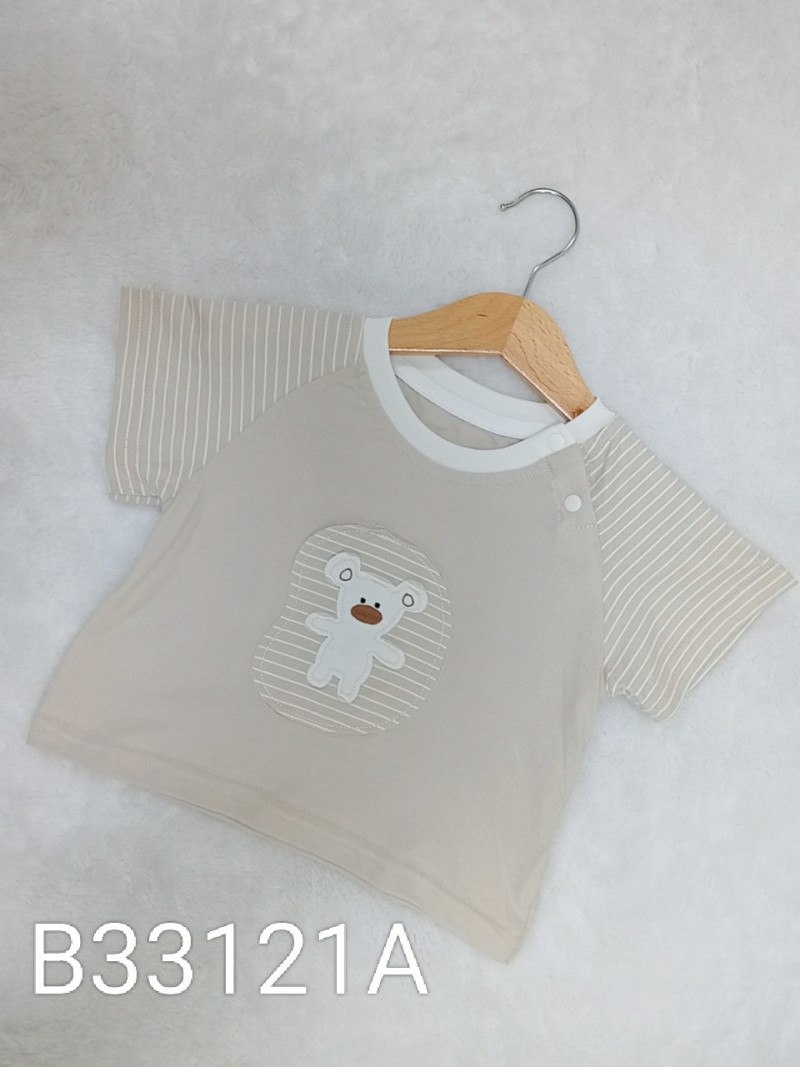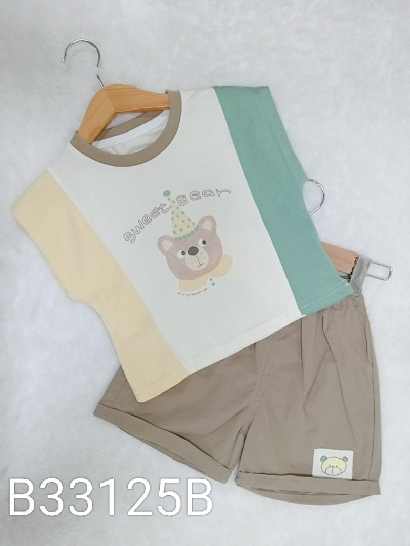 熱賣中🔥 即將售完B33125B_L8_杏底咖領派對小熊拼接黃綠袖上衣+咖底小熊貼布短褲套裝