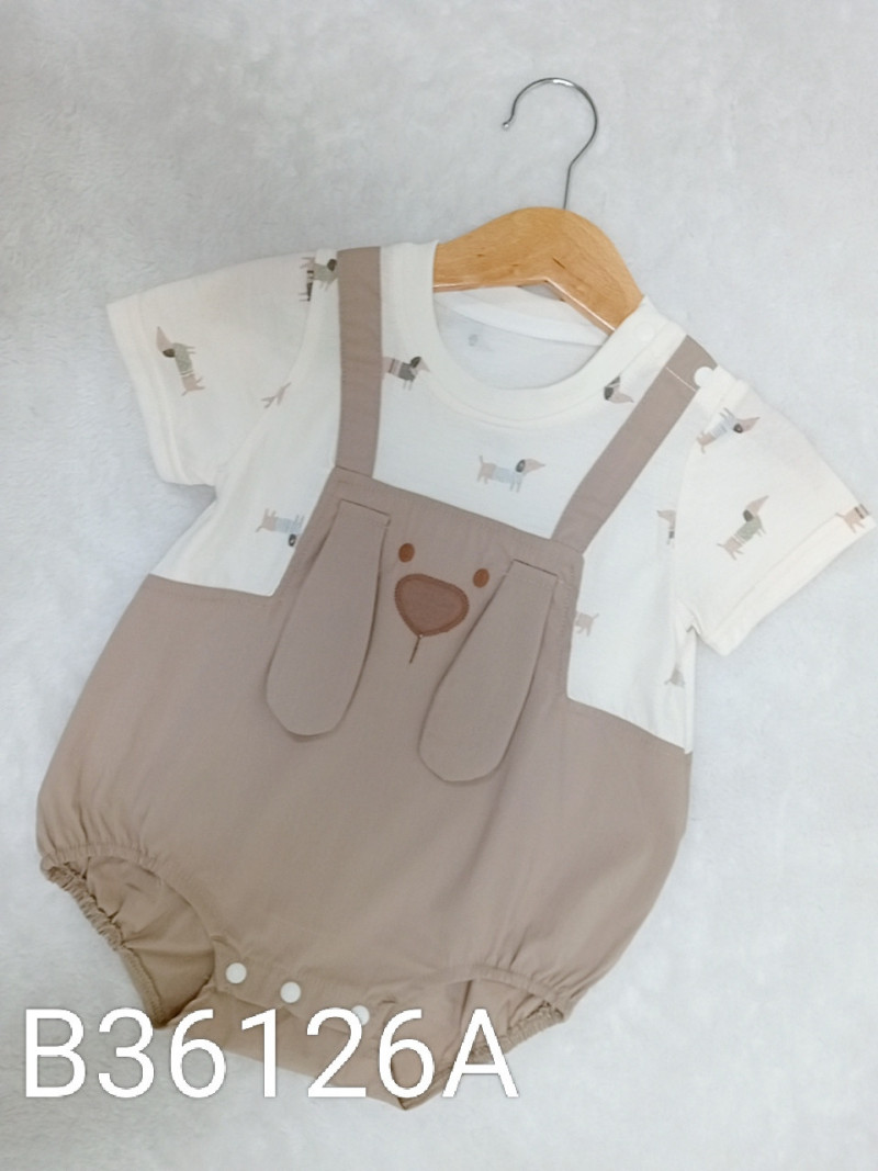 熱賣中🔥 即將售完B36126A_K14_杏拼接咖底狗狗立體耳朵臘腸狗吊帶假二件包屁衣