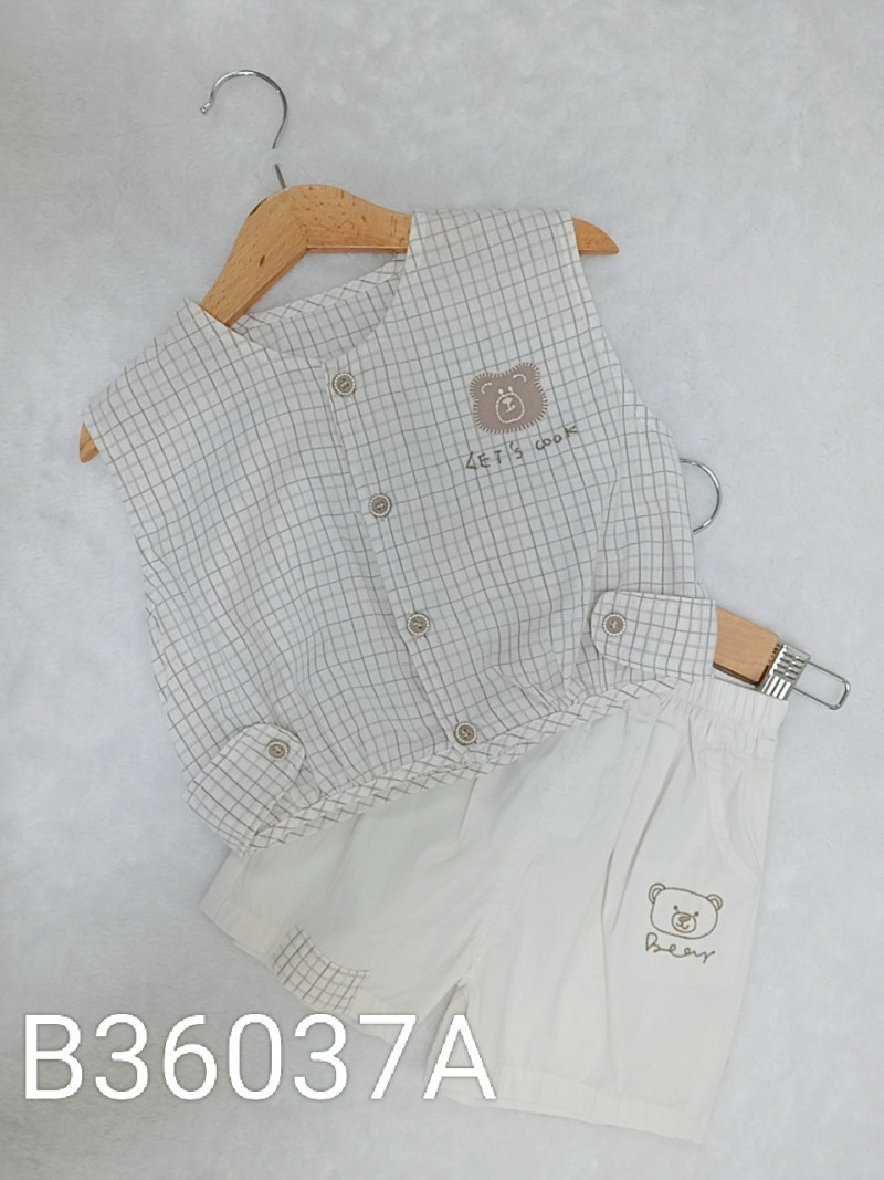 熱賣中🔥 即將售完B36037A_L13_杏底格紋英字小熊貼布造型背心+杏色小熊刺繡短褲套裝