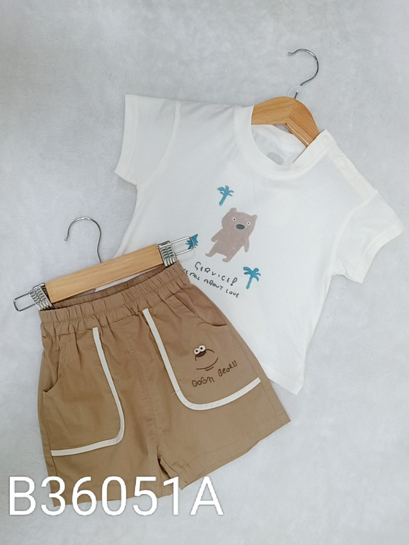 熱賣中🔥 即將售完B36051A_L19_米白底英字塗鴉小熊肩釦上衣+咖底杏邊刺繡短褲套裝