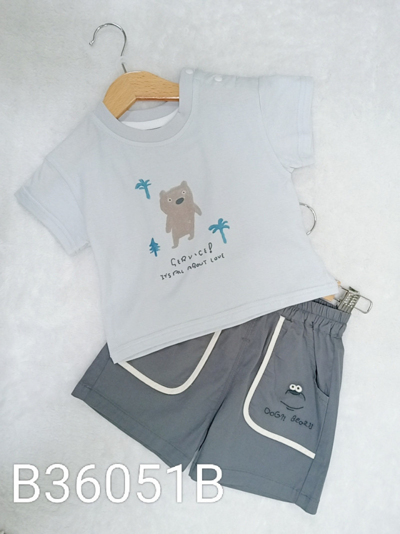 熱賣中🔥 即將售完B36051B_L20_藍底英字塗鴉小熊肩釦上衣+灰底杏邊刺繡短褲套裝