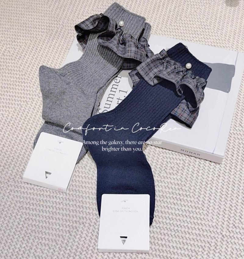 熱賣中🔥 即將售完74標 預購 格紋荷葉滾邊襪 藍/灰 1雙 韓國連線價220喜歡+1帶哪裡取(A嘉義取B台中取C郵寄)