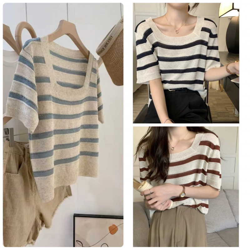 熱賣中🔥 即將售完A122慵懶方領條紋針織上衣