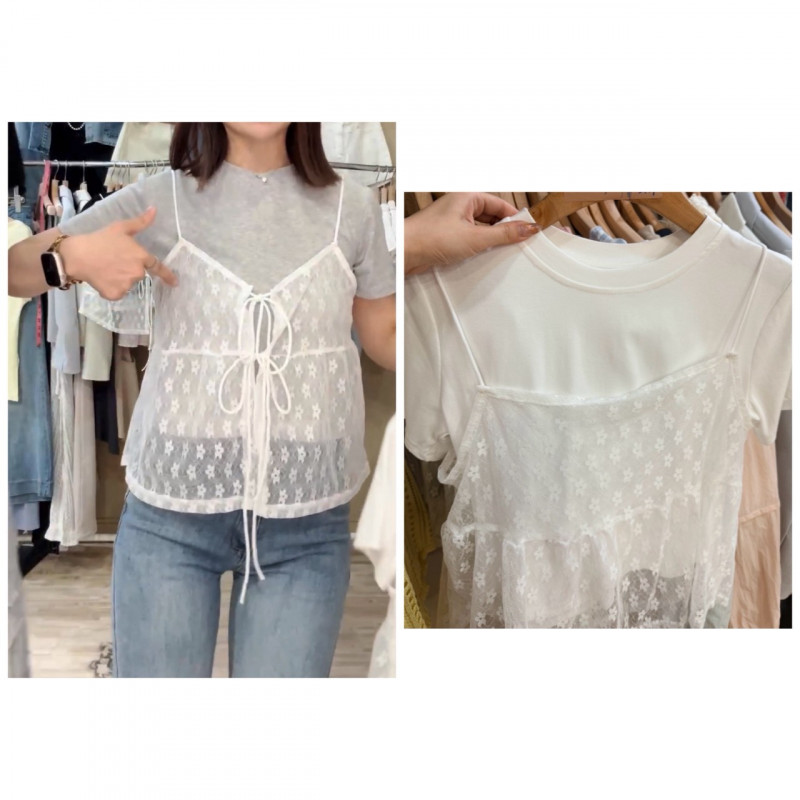 熱賣中🔥 即將售完A116韓式疊穿蕾絲透膚背心+棉tee