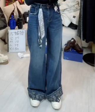 熱賣中🔥 即將售完16.A03005807復古腰果花翻邊牛仔褲-藍 M,L,XL