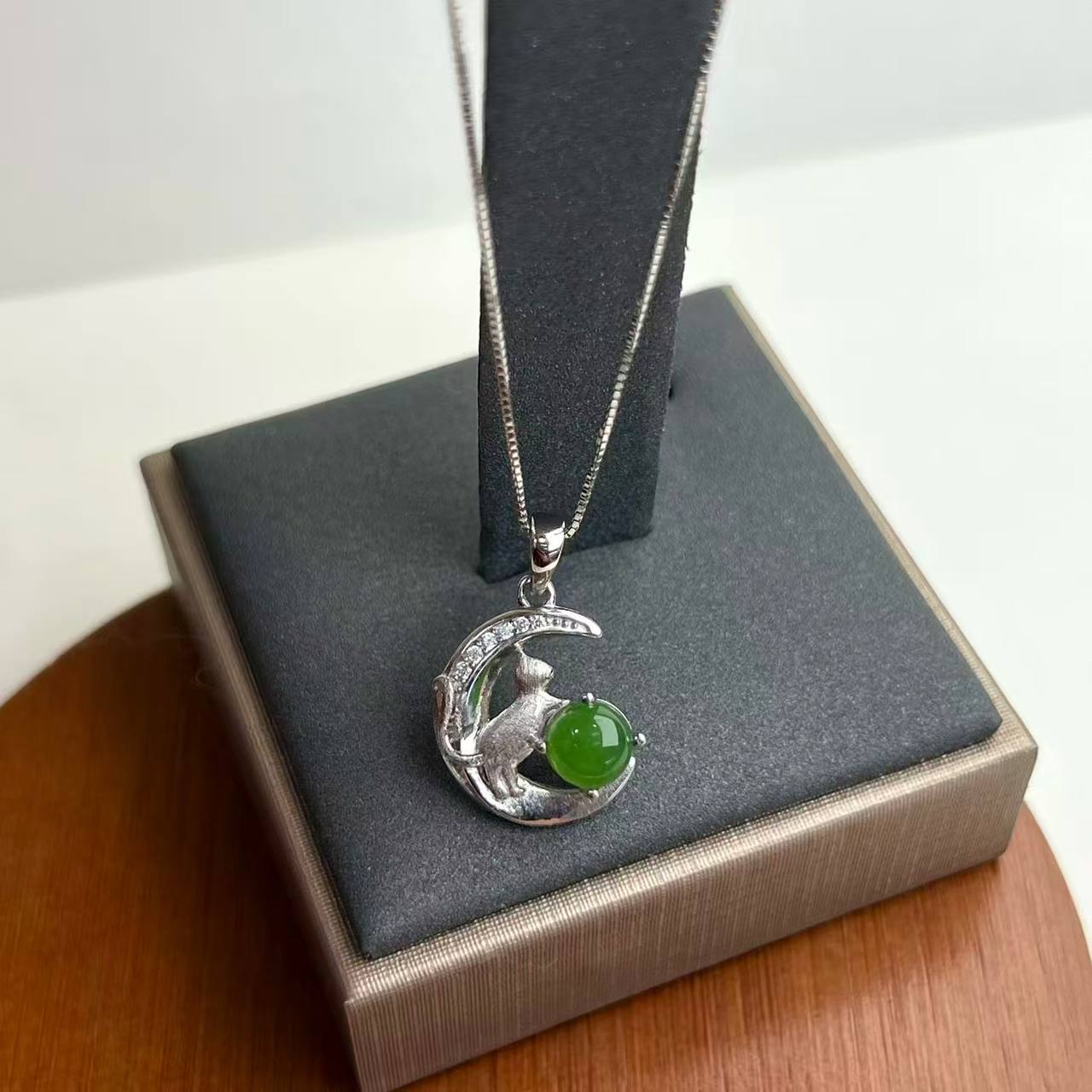 Hot Selling🔥 Almost Sold OutAJ288-和田碧玉6mm半圆弯月小猫吊坠(银)