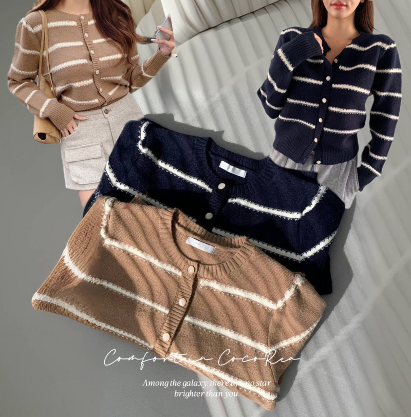 熱賣中🔥 即將售完84標 預購 荷葉橫條針織羊毛外套 藍/奶茶 胸104 長55 韓國連線價1580喜歡+1帶哪裡取(A嘉義取B台中取C郵寄)